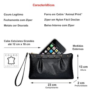 Bolsa clutch, carteira de mão e porta celular em COURO, delicada, elegante, moderna e prática, possui 1 bolso interno fechado por zíper para pequenos objetos, todos os metais (argola, mosquetões, zíperes, etc) são na cor dourada. O fechamento principal é feito com zíper em nylon de fácil deslize. Possui alça fixa externa de mão. Ela tem a medida ideal para levar pequenos objetos, carteiras pequenas, celulares de tamanhos médio e grande, etc.