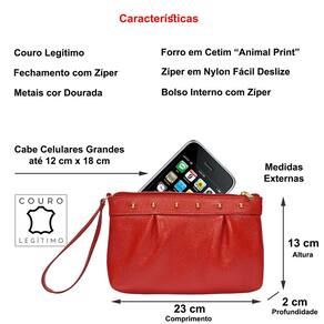 Bolsa clutch, carteira de mão e porta celular em COURO, delicada, elegante, moderna e prática, possui 1 bolso interno fechado por zíper para pequenos objetos, todos os metais (argola, mosquetões, zíperes, etc) são na cor dourada. O fechamento principal é feito com zíper em nylon de fácil deslize. Possui alça fixa externa de mão. Ela tem a medida ideal para levar pequenos objetos, carteiras pequenas, celulares de tamanhos médio e grande, etc.