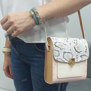 A Bolsa couro Armazem RR Bijoux com lateral em madeira média rosa animal print é produzida no Brasil em couro com as laterais em madeira de lei que levam uma camada de verniz marítimo deixando sua bolsa super resistente água e queda.