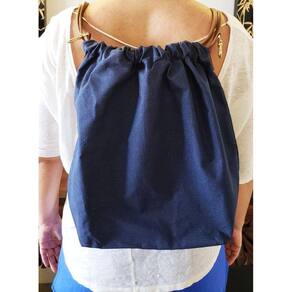 Laminado 100% PVC Cristal com acabamento em tecido sintético caramelo. Tecido da sacochila 100% algodão azul tipo jeans. Necessaire em cristal com mesmo acabamento em tecido sintético caramelo.
