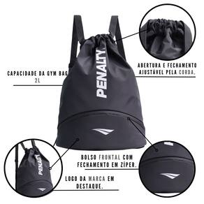 Características: - Abertura e fechamento ajustável pela corda - Bolso frontal com fechamento em zíper - Logo da marca em destaque - Zíper personalizado com o logo da marca - Capacidade da gym bag: 2l - Composição: poliéster - Peso máximo suportado: 8kg - Tamanho: 47x32x16.5 cm