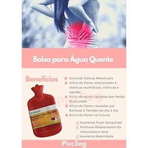 Bolsa de água térmica para compressa bioland 2 litros anvisa As principais aplicações são: - cólicas - doenças reumáticas, crônicas e agudas - lesões musculares - estresses e inflamações - dores na coluna - extração dentária - bolsa água quente e fria para compressas. - feita em borracha super resistente. - bico funil. - tampa rolha com borracha que permite vedação perfeita. - rosca de metal - térmica. - medida total da bolsa: - comprimento: 36 cm. - largura: 18,5 cm. - capacidade: 2 litros. - cor vermelha Atenção: não recomendamos a utilização de água acima de 80 cº, nunca utilize água fervendo pois faz com que a bolsa estoure . Não aqueça a bolsa no microondas, pois o produto contém peças de metal