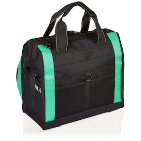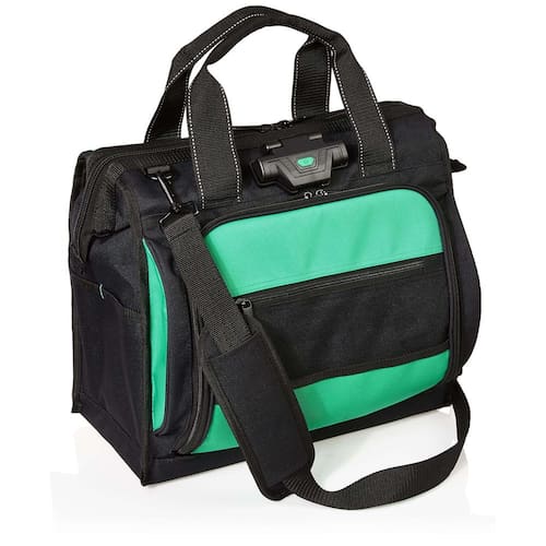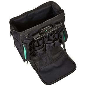 - Inclui uma bolsa de ferramentas iluminada de 40 bolsos feita de poliéster preto durável com pés de base que reduzem a abrasão