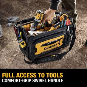Bolsa de ferramentas DEWALT, bolsa de ferramentas com tampa aberta, 20" x 10" (DWST560106) — SUPORTA CONDIÇÕES DIFÍCEIS — Ajude a proteger objetos de valor com um compartimento IP54 resistente à água e uma base injetada à prova d'água. - CONSTRUÍDO COM MATERIAIS DURÁVEIS — Resiste a locais de trabalho difíceis com tecido durável de 1680 denier e lona repelente de sujeira. - OTIMIZE A ORGANIZAÇÃO - Utilize 36 bolsos e presilhas para manter os itens essenciais prontamente disponíveis. - PROTEJA OBJETOS DE VALOR — Proteja bens pessoais valiosos no compartimento frontal com zíper. - Design de alta visibilidade — Obtenha visibilidade clara das ferramentas com tecido interno amarelo de alta visibilidade.
