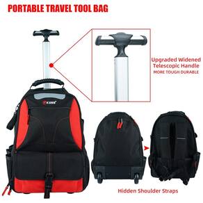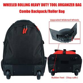 PROJETO ÚNICO A bolsa de ferramentas rolante oferece um amplo espaço aberto para acesso rápido aos seus acessórios de ferramentas favoritos. Bolsos internos removíveis para organização de ferramentas podem ser movidos e s separadamente. Design amigável da almofada traseira, vire a almofada traseira para baixo para cobrir as rodas para manter suas roupas limpas