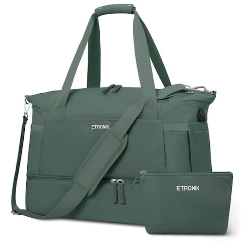 Se você está procurando uma bolsa de ginástica versátil e elegante que também pode funcionar como uma bolsa de viagem, nossa bolsa de ginástica feminina é a escolha perfeita. Com seu tamanho extragrande e vários bolsos, você pode armazenar facilmente todos os seus itens essenciais de academia e viagem, incluindo roupas, toalhas, sapatos, artigos de higiene pessoal e até mesmo seu laptop ou tablet. O compartimento separado para sapatos com ventilação ajuda a manter sua bolsa fresca e limpa, enquanto o bolso forrado de PVC à prova d'água mantém suas roupas ou toalhas molhadas separadas do resto de seus pertences. - Tamanho extra grande: com dimensões de 52 x 22 x 40 cm, nossa nova e melhorada bolsa de ginástica oferece ainda mais espaço para guardar suas roupas, toalhas, artigos de higiene pessoal, sapatos e outros itens essenciais. Adequado para viagens de 5 a 7 dias, não recomendado como bolsa de itens pessoais. - Bolsa esportiva separada a seco e molhado: esta bolsa feminina oferece um compartimento principal espaçoso para guardar suas roupas e itens. Um bolso forrado de PVC impermeável com zíper para roupas molhadas. Além disso, esta bolsa de viagem também oferece uma bolsa de maquiagem extra pequena para facilitar o armazenamento - Compartimento separado para sapatos com ventilações: esta bolsa grande de fim de semana tem um compartimento separado na parte inferior para seus sapatos e roupas sujas. E o compartimento para sapatos tem 2 saídas de ar para dispersar o mau cheiro dos sapatos - Estrutura firme e design removível: esta bolsa de mão é feita de nylon resistente à água para proteger seus itens com zíper de alta qualidade. As alças de ombro ajustáveis e removíveis têm acolchoamento confortável, o que pode reduzir a pressão ao carregar. Há uma alça de bagagem na parte de trás desta bolsa para facilitar sua viagem/viagem de negócios. - Bolsa de ginástica de ampla aplicação: uma escolha perfeita para carregar todos os seus itens essenciais de academia e viagem. Use-a como uma bolsa de bagagem, bolsa esportiva de academia, bolsa de fim de semana, bolsa de mão, bolsa de praia. Nossa bolsa de ginástica feminina é adequada para esportes internos e externos, como viagens, esportes, viagens de fim de semana, ioga, academia, praia, negócios ou outro uso diário