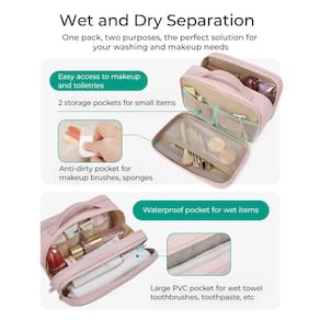 - Design de separação seca e úmida: os bolsos frontais e traseiros oferecem separação perfeita para seco e úmido. O bolso frontal inclui 2 bolsos de malha para itens como batom, rímel, esmalte e medicamentos, bem como um bolso de PVC para pincéis de maquiagem e esponjas. O bolso traseiro é ideal para toalhas, escovas de dentes, pasta de dente e outros itens molhados