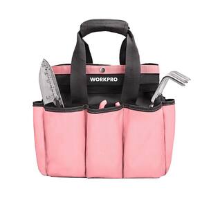 WORKPRO bolsa de ferramentas de jardim - Material durável - A bolsa de jardinagem é feita de tecido oxford de poliéster resistente a rasgos com materiais macios internos, que é resistente ao desgaste. A parte inferior desta bolsa de jardim é reforçada com placa grossa de PE, facilitando o levantamento - Grande capacidade: o tamanho interno de 30 cm x 30 cm x 15 cm oferece espaço suficiente para armazenamento. Bolsos externos e o cordão elástico expandem bem a capacidade de mais ferramentas - Bolsos profundos - Projetado com 8 bolsos externos para ferramentas práticas e frascos de spray, proporcionando fácil acesso e organização conveniente. Os bolsos são profundos o suficiente (20 cm ou mais) para evitar que os itens caiam ou percam acidentalmente - Alça ergonômica - a alça antiderrapante é acolchoada com espuma macia, confortável o suficiente para reduzir a fadiga ao carregar. Organizador portátil de ferramentas de jardim, mesmo para crianças - Fita rosa: de 1º de janeiro de 2025 a 31 de dezembro de 2025, sua compra deste produto resultará em uma doação mínima de $15.000 para ser doada para Helping Women Now
