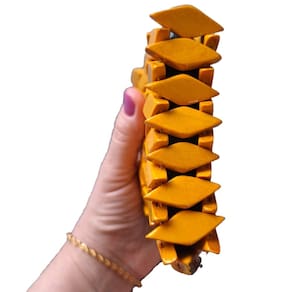 Bolsa confeccionada com pecinhas de madeira no formato de pequenos losângulos, pintados e envernizados, cor Amarela, com acabamento interno em cetim e fechamento com zíper.