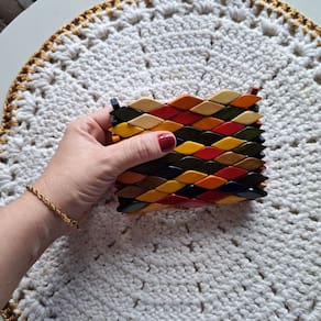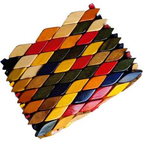 Bolsa confeccionada com pecinhas de madeira no formato de pequenos losângulos, pintados e envernizados, Colorida, com acabamento interno em cetim e fechamento com zíper.