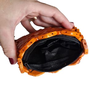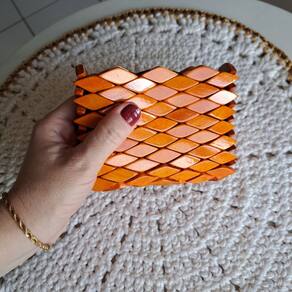 Bolsa confeccionada com pecinhas de madeira no formato de pequenos losângulos, pintados e envernizados, cor Madeira Clara, com acabamento interno em cetim e fechamento com zíper.