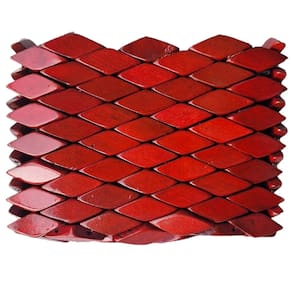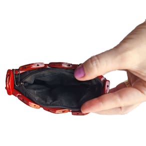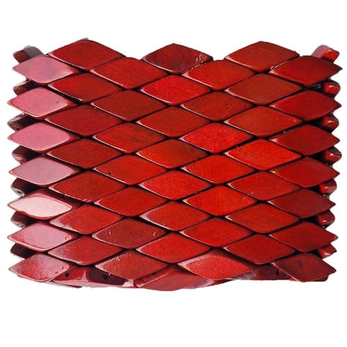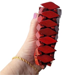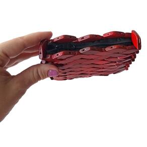 Bolsa confeccionada com pecinhas de madeira no formato de pequenos losângulos, pintados e envernizados, cor Vermelha, com acabamento interno em cetim e fechamento com zíper.