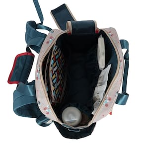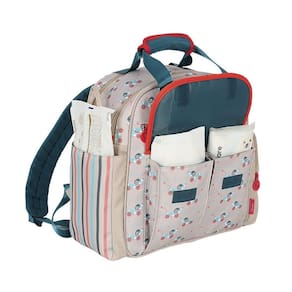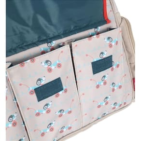 Compartimento principal de fecho em zíper. Na parte exterior, além de dois bolsos laterais sendo um deles com porta lenço, possui bolso térmico e impermeável. A mochila acompanha trocador simples. Possui alças ajustáveis e removíveis.