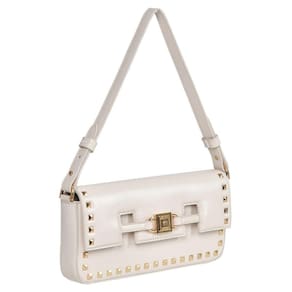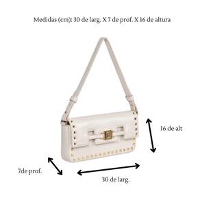 Bolsa de ombro feita em PU estruturado. Possui alça de ombro fixa com argola de metal personalizada. Lapela com aplicações de spikes e recortes. Abertura principal com botão magnético. Peça forrada com bolso interno de zíper. Etiqueta patch na parte interna. Placa frontal Via Marte de metal com alto relevo.