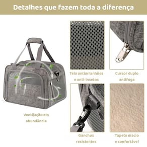Introdução: A bolsa de transporte é uma solução segura e confortável para o seu bichinho de estimação. Ideal para viagens de avião, pois suas medidas são aceitas na cabine pela maioria das companhias aéreas.