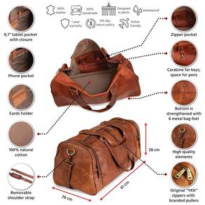 Capacidade interna de 45 L. Bergen é espaçosa o suficiente para roupas para uma viagem de fim de semana, garrafas de água, sapatos e outras coisas de ginástica Perfeito para viagens ou aventuras ao ar livre, Bergen é adequado como bagagem de mão na maioria das companhias aéreas ESTILO VINTAGE. Esta bolsa de viagem grande adiciona elegância retrô a todas as situações. Os 1.8 metros de metal protegem sua bolsa do desgaste. Usamos apenas zíperes YKK 100 metálicos, com elegantes puxadores da marca Berliner Bags. Carregue o pelas alças resistentes ou pendure o no ombro com a alça destacável Como presente especial incluímos uma etiqueta de bagagem em pele genuína, para que possa personalizar a sua mala e manter os seus pertences s COURO CURTIDO VEGETAL. A bolsa Bergen é feita à mão com couro curtido vegetal de alta qualidade. O curtimento vegetal é um antigo processo de curtimento natural que utiliza taninos e óleos vegetais sem produtos químicos nocivos. Devido a este processo de produção, cada mochila é à prova dágua e tem uma cor única e acabamento vintage. Em vez de secar ou desgastar, o couro curtido com vegetais amacia e cria uma bela pátina ao longo do tempo MANTENHA SE ORGANIZADO. Com o espaçoso compartimento central Bergen, bolso para tablet de , bolso especial para celular e porta chaves, você estará totalmente preparado para qualquer situação. Este fim de semana inteligente também possui um porta cartões especialmente projetado, porta canetas e um bolso interno com zíper que o manterá organizado em movimento Os bolsos externos com zíperes convenientes são ótimos para sapatos ou para guardar sua carteira, telefone e qualquer outra coisa que você precise manter à mão Marca: Não Informado