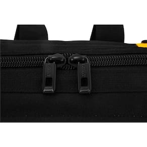 Destaques Comercial: Bolsa em lona com reforços metálico e plástico, zíper duplo, 4 apoios e 32 divisões internas e externas.