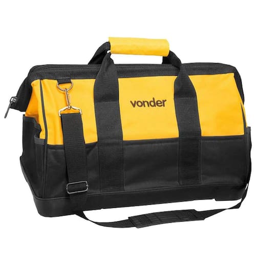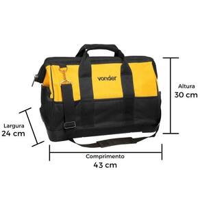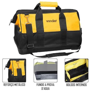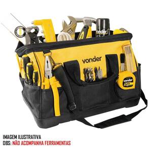 Indicada para acondicionamento de ferramentas e acessórios em geral. Confeccionada em lona reforçada, alça de nylon, reforço metálico na parte superior, alça para transporte, ziper reforçado, fundo plástico reforçado à prova d'água, possui abertura total e 22 divisões/bolsos pequenos, sendo 12 internos e 10 externos para acomodação de pequenos acessórios.