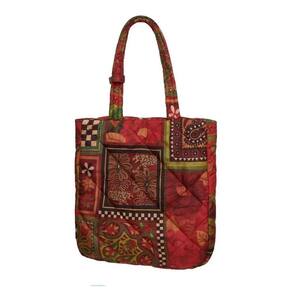 A bolsa é confeccionada em patchwork almofadado em tecido nylon acetinado. Possui aba frontal com fechamento por botão de imã. As alças são mais largas com 4 cm de largura, ajustáveis de 80 cm a 100 cm, com fivela de click. Bolso traseiro com fechamento a zíper.