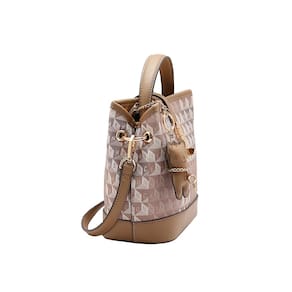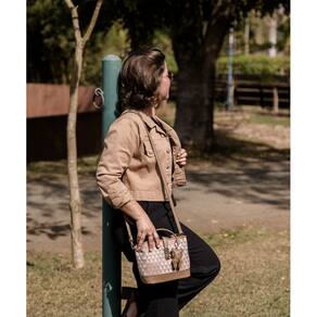 DESCRIÇÃO DO PRODUTO Modelo: Bolsa Feminina Bucket Monograma Tridimensional Marca: Chenson Material: Poliuretano impermeável Cor: Bege Fechamento: Zíper Formato: Bucket estruturado Divisórias: Compartimento único