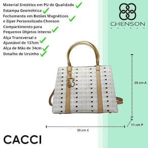 Pensada para acompanhar a rotina da mulher contemporânea, essa bolsa oferece excelente espaço interno e compartimento ideal para organizar pequenos objetos, mantendo tudo em ordem e sempre à mão. O fechamento em botões magnéticos e o ecler personalizado Chenson garantem segurança e praticidade, enquanto o acabamento bem estruturado valoriza o visual e transmite a sensação de qualidade que a marca carrega em cada detalhe.
