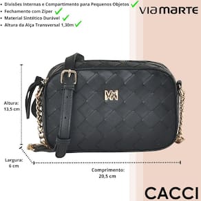 A Bolsa Camera Bag Via Marte é a escolha ideal para quem deseja unir funcionalidade e um toque de sofisticação ao visual. Confeccionada em material sintético de qualidade, ela se destaca pela textura tressê, que adiciona charme e personalidade à peça. O design contemporâneo é evidenciado pela alça ajustável com detalhe em corrente, proporcionando estilo e versatilidade no uso. O espaço interno é forrado e bem planejado, oferecendo praticidade no dia a dia com compartimentos que facilitam a organização dos seus pertences. O toque final fica por conta da placa metálica com o logo da marca, posicionada com elegância na parte frontal, ressaltando o cuidado com os detalhes e a identidade da Via Marte. Uma bolsa perfeita para compor produções urbanas e cheias de atitude.