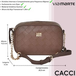 A Bolsa Camera Bag Via Marte é a escolha ideal para quem deseja unir funcionalidade e um toque de sofisticação ao visual. Confeccionada em material sintético de qualidade, ela se destaca pela textura tressê, que adiciona charme e personalidade à peça. O design contemporâneo é evidenciado pela alça ajustável com detalhe em corrente, proporcionando estilo e versatilidade no uso. O espaço interno é forrado e bem planejado, oferecendo praticidade no dia a dia com compartimentos que facilitam a organização dos seus pertences. O toque final fica por conta da placa metálica com o logo da marca, posicionada com elegância na parte frontal, ressaltando o cuidado com os detalhes e a identidade da Via Marte. Uma bolsa perfeita para compor produções urbanas e cheias de atitude.