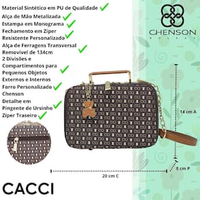 Com material resistente e acabamento de alta qualidade, ela oferece durabilidade e conforto em cada uso. O interior é inteligentemente dividido em dois compartimentos, com espaço suficiente para manter todos os seus pertences bem organizados. Há divisões internas e externas que facilitam o acesso aos itens mais utilizados, enquanto o bolso traseiro acrescenta praticidade ao permitir guardar pequenos objetos de forma segura e discreta. O forro interno personalizado reflete o cuidado e o padrão de excelência da marca Chenson.