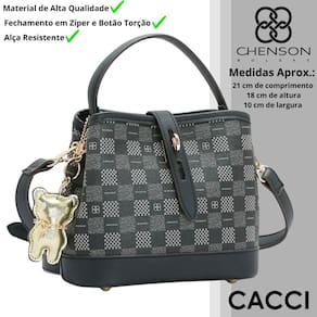 Bolsa Feminina Chenson Pequena Monograma Classico Mão 3484518 Poliuretano, fechamento com fecho-éclair e botão torção, forro em tecido personalizado, compartimento para pequenos objetos, 3 Divisões, detalhes na frente, alça em poliuretano, acabamento em costura contrastante.