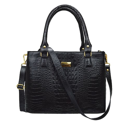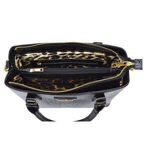 MATERIAIS: Couro origem bovina com textura croco Metais (fechos, argolas, rebites, etc) com banho dourado e antioxidante Zíperes de metal na cor do produto Costura na cor do couro Forro com textura tipo animal print (oncinha), floral ou similar.