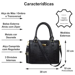 Bolsa feminina tamanho médio, estruturada, para usar na Mão, no Ombro ou Transversal em Couro. A queridinha das brasileiras, essa bolsa é moderna e elegante. Contém 3 divisões internas, alça curta e comprida (com comprimento regulável), muito prática e fácil de usar, ideal para o dia a dia ou em produções casuais que necessitem de estilo sem abrir mão da elegância. Na parte traseira possui 1 bolso fechado por zíper, proporcionando segurança para seus pequenos objetos. Todos os metais são dourados para combinar com a sofisticação e elegância que um produto em couro merece. O acabamento interno do forro é com texturas variadas tipo animal print (padrão oncinha), floral ou similar. Em uma das divisões internas possui um bolsinho fechado por zíper e outros dois abertos para pequenos objetos ou celular. O fechamento da parte superior é feito também com zíper.