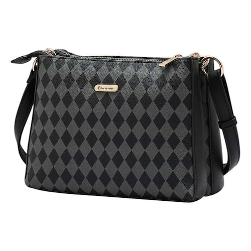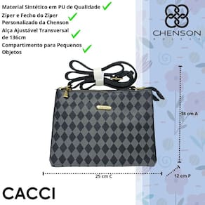 Feita em PU de alta qualidade, esta bolsa combina elegância e praticidade em um design sofisticado. Possui duas divisões e um compartimento ideal para pequenos objetos, garantindo organização no dia a dia. O forro em tecido personalizado com o logo Chenson adiciona um toque exclusivo, enquanto o fechamento ecler principal personalizado oferece segurança. A alça ajustável transversal de 136 cm proporciona conforto no uso, e o acabamento em costura contrastante, aliado às ferragens douradas, eleva a sofisticação do modelo.