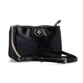 Bolsa tiracolo de tamanho pequeno com acabamento macio e formato estruturado.. Fechamento principal em zíper de metal.. Possui dois bolsos externos embutidos na parte frontal e posterior da bolsa, com fechamento em botão imã.. Alça tiracolo de couro com regulagem de altura e com detalhe de correntes, fixa no produto.. Detalhe para aplicação da placa luas com forração em couro na parte frontal da bolsa.. No interno, bolso sem zíper.. L: 24cm x A: 16cm x P: 8cm..