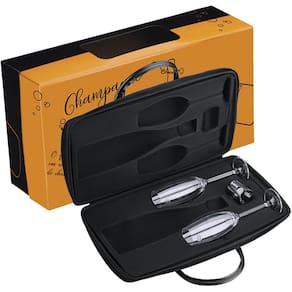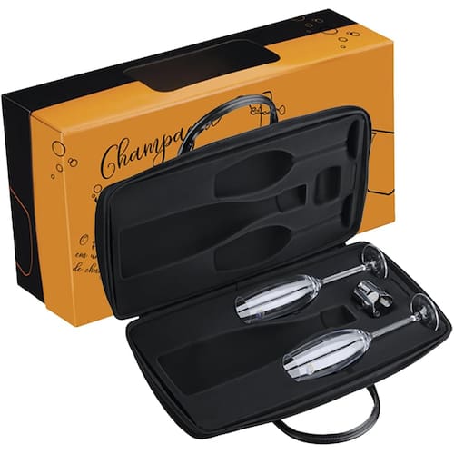 Além da maleta exclusiva acompanha 2 taças feitas de cristal, tornando-as além de fina muito mais resistentes que as taças convencionais. Traz consigo uma tampa para espumante exclusiva para você não ter preocupação caso não beba a garrafa por inteiro, com vedação de qualidade irá preservar o gás, aroma e principalmente o sabor de seu espumante mantendo ele com a mesma essência de lacrado.