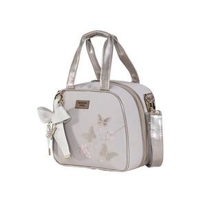Na cor bege, ela conta com acabamentos na cor dourada cintilante, super delicada, é muito sofisticada, tem tamanho pequeno, acompanha também um laço, no tom de bege e detalhes bordados no bolso frontal, que dá um charme para a mesma.