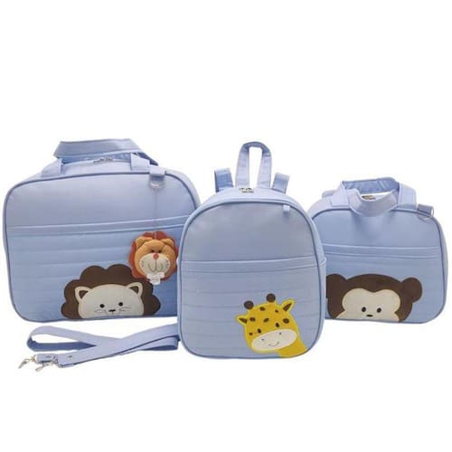 Bolsa maternidade safari Cor: azul bebe Kit maternidade bolsa grande e bolsa média Medidas da bolsa grande: 40 cm de comp 30 cm de alt 16 cm de larg Medidas da bolsa média: 30 cm de comp 22 cm de alt 16 cm de largCom mochilaChaveiro. Alça de mão dupla e com alça de ombro removível Composição: Matelassê 68% poliester Eva 30% Kamurcinha pvc 2% Confeccionadas em material sintético de ótima qualidade não descasca forro interno impermeável: kamurcinha pvc Fácil de limpar produto com ótima qualidade fabricado no brasil feitas com dedicação e cuidado para o seu bebê