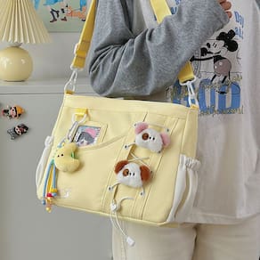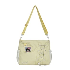 Material: tela Tamanho: 31x10x25 cm Peso: 350 g Aparência escolar elegante: esta bolsa mensageiro de ombro combina o estilo do campus japonês com elementos de design moderno, como detalhes frontais com cadarço e um bolso transparente para cartões fotográficos. Layout funcional: com tamanho de 31x10x25cm, com um compartimento principal espaçoso e bolsas laterais externas, é ideal para transportar notebooks, artigos de papelaria, um tablet e itens essenciais para o dia a dia. Leve e durável: pesando apenas 350 g, a construção em lona é resistente o suficiente para uso regular, mantendo-se confortável de transportar durante todo o dia. Design de alça ajustável: a alça transversal é ajustável para atender às diferentes preferências de transporte, seja usada sobre o ombro ou sobre o corpo. Perfeito para estudantes e adolescentes: uma ótima combinação para a escola, passeios de fim de semana ou uso diário. Seu estilo divertido combina perfeitamente com roupas casuais ou inspiradas em anime.