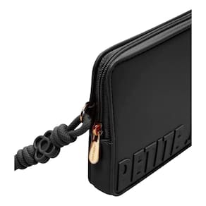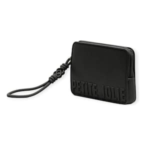 Carteira preta de tamanho pequeno. O modelo vem no shape retangular com fechamento superior em zíper esportivo. Possui logomania com o nome Petite Jolie em destaque na capa. Com alça de mão que imita atacador em J-Lastic.