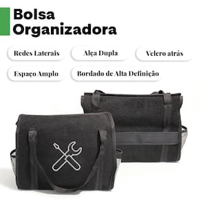 A bolsa organizadora para porta-malas é feita de carpete, possui a logo da montadora do carro bordada dando personalidade, possui tiras autocolantes interno para melhor vedação, tiras autocolantes na parte traseira para ser fixado no porta malas, assim deixando mais seguro. Ela possui alças para ser transportada, facilitando seu manuseio.