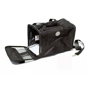 Bolsa preta, em lona, para transporte de pets de até 8,0 kgs, dobrável, e autorizada para cabines de aeronaves, com colchonete e alça de segurança internos. Confeccionado em lona reforçada, e alças manuais e de ombreira. Cortinas lateriais para fechamento opcionais.