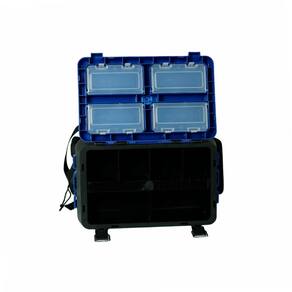Com três compartimentos amplos, permite acomodar apetrechos de diferentes tamanhos com total organização. Possui bandeja lateral, bolsos frontais e laterais, além de porta-squeeze para manter tudo ao alcance. Seu diferencial está no corpo rígido e forro acolchoado, que permite o uso da tampa como assento durante a pescaria.