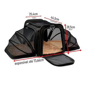 Características do Produto: - Confeccionada nas especificações para embarque na cabine de aviões da maioria das companhias aerias. - Acomoda confortavelmente pets de até 14Kg; - Aberturas frontal e lateral que facilitam a entrada e saída do Pet; - Fundo interno rígido removível, fácil de higienizar; - Alta qualidade de fabricação e detalhe; - Super arejada, confeccionada com tela de alta resistência nas laterais e topo; - Totalmente dobrável e fácil de guardar.