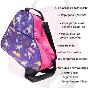 A Bolsa De Transporte Para Patins Quad Roller - Cor; Unicórnio lilás com Rosa Pink é a opção perfeita para quem busca praticidade e conforto ao transportar seus patins quad. Feita com material leve e resistente em courino, essa bolsa oferece uma proteção reforçada para guardar e transportar seus patins quad e inline.
