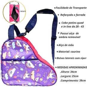 A Bolsa De Transporte Para Patins Quad Roller - Cor; Unicórnio lilás com Rosa Pink é a opção perfeita para quem busca praticidade e conforto ao transportar seus patins quad. Feita com material leve e resistente em material sintético, essa bolsa oferece uma proteção reforçada para guardar e transportar seus patins quad e inline. Essa bolsa é perfeita para os patinadores que querem se destacar durante os passeios. Além disso, ela foi desenvolvida para ser versátil e suportar diferentes tamanhos de patins infantis quad, proporcionando facilidade e leveza no transporte. A Bolsa De Transporte Para Patins Quad Roller possui alças ajustáveis e removíveis, permitindo que você a carregue tanto nos ombros quanto nas mãos. Além disso, ela conta com bolsos laterais com zíper, proporcionando espaço extra para guardar pequenos objetos. Com medidas aproximadas de altura: 34cm, largura: 25cm e comprimento: 39cm, essa bolsa é compacta e prática, ideal para levar seus patins para onde quiser. Seu material em material sintético garante durabilidade e resistência, além de ser fácil de limpar. A Bolsa De Transporte Para Patins Quad Roller é perfeita para quem busca conforto e praticidade no transporte de seus patins. Garanta já a sua e tenha seus patins sempre protegidos e prontos para a diversão. Especificações técnicas: - Material: material sintético - Cor: Unicórnio lilás com Rosa Pink - Alças ajustáveis e removíveis - Bolsos laterais com zíper - Medidas aproximadas: altura: 34cm, largura: 25cm, comprimento: 39cm 1. Essa bolsa é compatível com patins quad e inline Sim, essa bolsa foi desenvolvida para suportar diferentes tamanhos de patins quad, proporcionando facilidade e leveza no transporte. 2. Posso carregar a bolsa nos ombros e nas mãos Sim, a Bolsa De Transporte Para Patins Quad Roller possui alças ajustáveis e removíveis, permitindo que você a carregue tanto nos ombros quanto nas mãos. 3. A bolsa possui espaço extra para guardar pequenos objetos Sim, ela conta com bolsos laterais com zíper, proporcionando espaço extra para guardar pequenos objetos. 4. Qual o material da bolsa A bolsa é feita com material leve e resistente em material sintético, garantindo durabilidade e resistência. 5. Quais são as medidas aproximadas da bolsa A bolsa possui medidas aproximadas de altura: 34cm, largura: 25cm e comprimento: 39cm, sendo compacta e prática para transportar seus patins. Marca: Não Informado