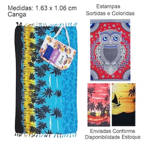 Canga: Cores e estampas temáticas, formando um kit cheio de beleza. Franja nas duas pontas. Tamanho aproximado: 160 cm de comprimento x 102 cm de largura. Tecido 100% Poliéster.