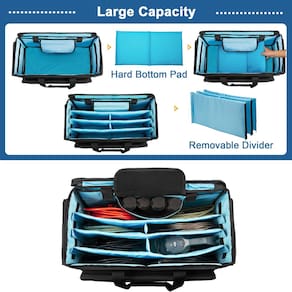 - 3 formas de transporte: 2 alças longas acolchoadas e 1 alça de ombro removível para facilitar o transporte do organizador de armazenamento de cabos ao sair; o carrinho telescópico removível (até 93,5 cm) permite que você carregue acessórios pesados