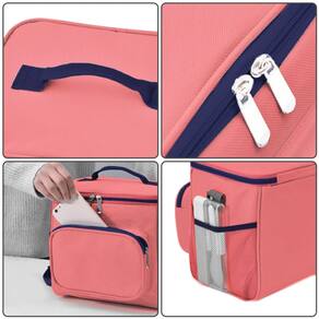 A parte externa da bolsa térmica é feita de tecido Oxford de alta densidade resistente à água e sujeira para maior durabilidade e fácil limpeza. O forro interno é feito de material EVA ecológico com acolchoamento espesso de espuma perolada, que mantém os alimentos quentes, frios ou frios por horas. Perfeito para uso na estrada, piqueniques, viagens rodoviárias, almoço no escritório, na praia e muito mais. A alça acolchoada macia garante um transporte confortável. Com uma alça reforçada na parte superior e uma alça removível e ajustável que oferece mais opções de transporte. A lancheira (26* 18* 23 cm) foi projetada para máxima eficiência de armazenamento, com um compartimento principal com zíper, um bolso frontal com zíper, dois bolsos de malha e um bolso interno de malha, que oferece muito espaço para embalar todos os alimentos e lanches necessários durante todo o dia. Também há espaço para suas chaves, cartões, carregadores de telefone, guardanapos, garrafas de água, utensílios, chicletes e outros itens pequenos que você precisa diariamente. O design de ampla abertura facilita o preenchimento e o transporte da comida. Além disso, o design moderno e leve permite usá-lo como lancheira, bolsa de resfriamento, sacola de piquenique, sacola de artigos diversos ou sacola de compras. Em geral, essa bolsa térmica é uma ótima opção para quem deseja movimentar seus alimentos e bebidas com eficiência e mantê-los frescos e isolados. Com muitos compartimentos e opções de transporte, é uma solução prática e funcional para qualquer situação.