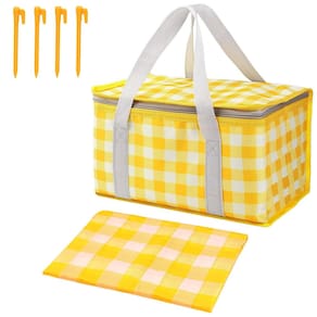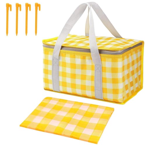 - Conteúdo da embalagem: 1 bolsa térmica para piquenique, 1 toalha descartável para piquenique, 4 estacas amarelas para fixação no chão