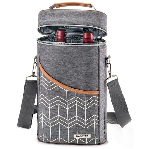 2 Garrafas Wine Tote Este refrigerador de vinho é leve e portátil, possui uma alça de transporte de couro macio e alça de ombro ajustável. Conveniente para você trazer seu vinho para festa de amigos, ch etc. Proteção e isolamento do poço o forro do porta vinhos é à prova dágua e à prova de vazamentos, fácil de limpar. O enchimento interno de esponja espessa pode manter o vinho frio por um longo tempo, enquanto isso protege eficazmente as garrafas de vinho de colisões externas. Dentro do divisor acolchoado espesso, as duas garrafas de vinho, champanhe podem ser separadas independentemente, evitando colisões entre si Design prático há uma tira elástica para o saca rolhas incluído na parte superior da sacola de vinho. É mais conveniente abrir a garrafa de vinho quando estiver pronto para beber. O bolso frontal para bolsa de vinho é conveniente para zenar itens pequenos, como telefones celulares, carteiras, chaves, etc. Ótimos presentes para amantes de vinho formato elegante, aparência estilosa e design funcional. Esta sacola de vinho é adequada para os amantes do vinho em piqueniques, uso não autorizado, qualquer ocasião em que o vinho esteja envolvido. São presentes de aniversário perfeitos, presentes de Natal, presentes de eventos para bons amigos, ideias de presentes perfeitos para mulheres