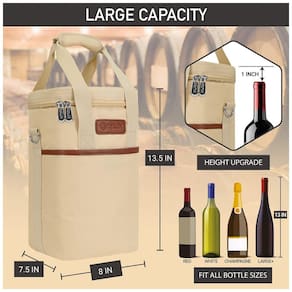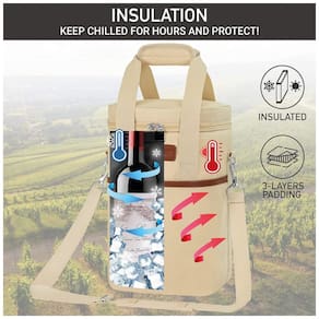 SACO DE VIAGEM PORTÁTIL PARA VINHO Leve suas garrafas de vinho favoritas com você para um restaurante, piqueniques, ao ar livre, parque, praia, jantar ou festa. Também é um ótimo presente para amantes de vinho e anfitriãs presentes. PROTEÇÃO DA GARRAFA DE VINHO E CONTROLE DE TEMPERATURA Revestimento acolchoado à prova de vazamentos para proteger as garrafas de quebrar durante a viagem, enquanto seu material de isolamento térmico mantém a temperatura do seu vinho estável se estiver refrigerado ou em temperatura ambiente DESIGN CONVENIENTE E INTELIGENTE Apresenta uma alça de ombro ajustável e destacável junto com alças de mão acolchoadas para diferentes estilos de transporte. A aba interior versátil garante que suas garrafas de vinho caibam independentemente do tamanho e oferece proteção acolchoada na divisória. Bonito e durável Feito de poliéster 600D de alta qualidade para garantir máxima durabilidade e acabamento em couro PU para um toque de elegância. Esta bolsa de vinho é clássica e elegante. É um presente de vinho perfeito, presente de aniversário ou presente de dia dos pais